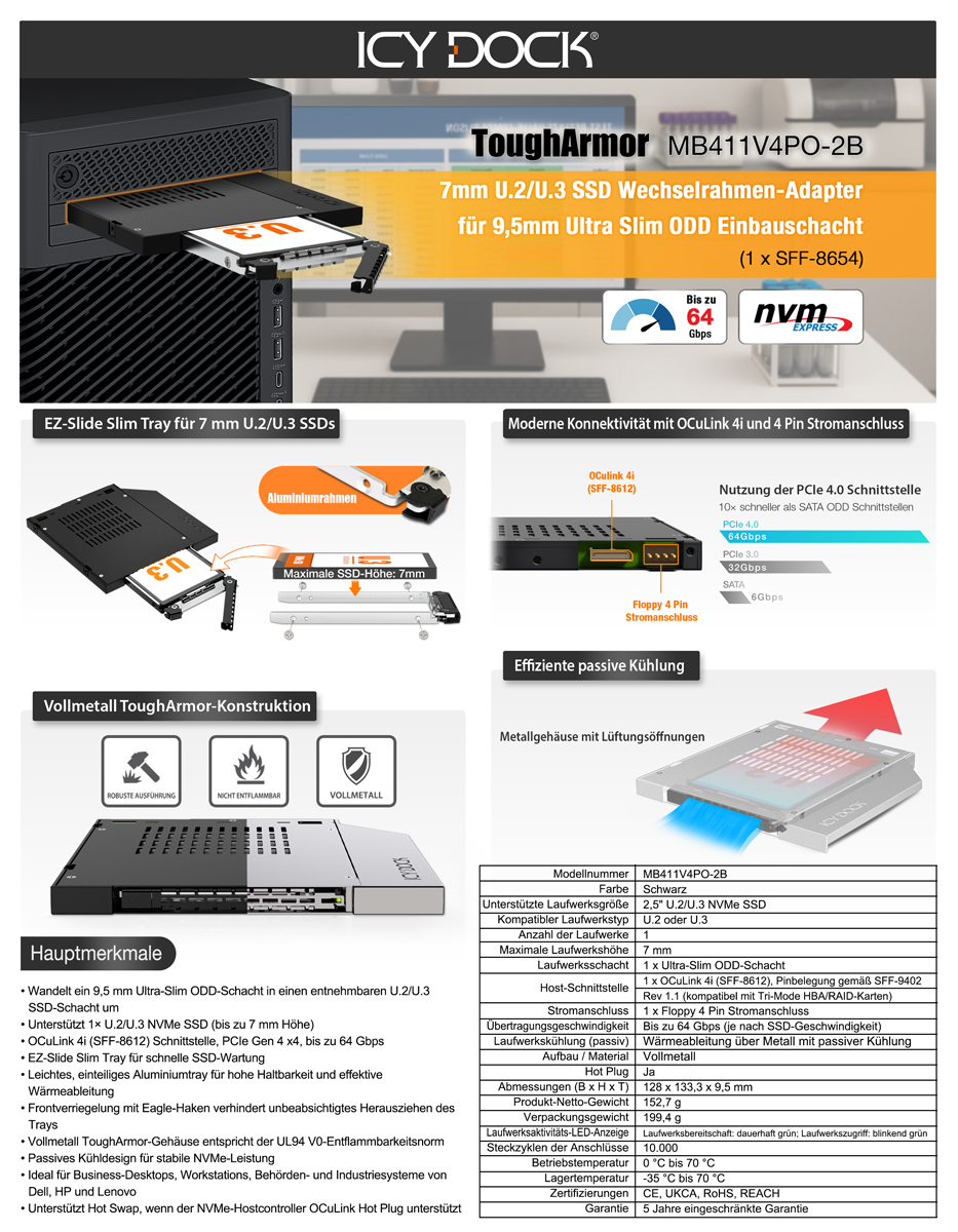 | • | Converte uno slot ODD Ultra-Slim da 9,5 mm in uno slot rimovibile per SSD U.2/U.3 |
