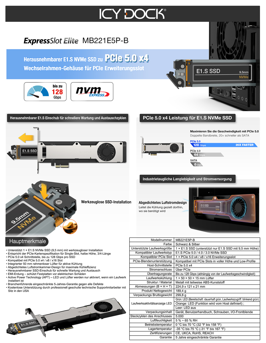 | Kompatibler Laufwerkstyp: | E1.S PCIe 5.0/4.0/3.0 NVMe SSD |